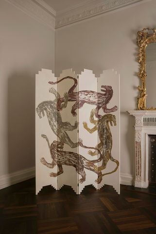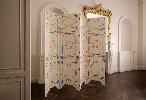 ERDEI'S COLLECTION MARKS THE GENESIS OF AN ARTISTIC JOURNEY, WHERE HE DELVES INTO HIGHLY DECORATIVE FURNITURE PIECES. THE HAND-PAINTED FOLDING SCREENS ARE A TESTAMENT TO HIS ARTISTIC VISION, FEATURING WHIMSICAL LINES AND SOFT WARM HUES INFLUENCED BY POMPEIIAN FRESCOES AND THE FRENCH SURREALIST MOVEMENT. THE DESIGNS SPAN TROMPE L’OEIL COLUMNS AND BOISERIE DETAILS, INTRICATELY CONSTRUCTED FROM INTERLINKING GEOMETRIC ELEMENTS, MYTHOLOGICAL FIGURES, AND CONSTELLATIONS EMBELLISHED WITH GOLD LEAF APPLIQUES.